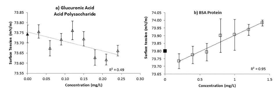 图 5.a) 葡糖醛酸,一种酸性多糖,证明在低浓度下 SFT 降低。 b) 相反,BSA 蛋白在低 专注。 然而,BSA 在较高浓度下再次降低。 低浓度下 SFT 的这种增加可以通过水中 pH 值的降低来解释 由 BSA 引起,图 6。