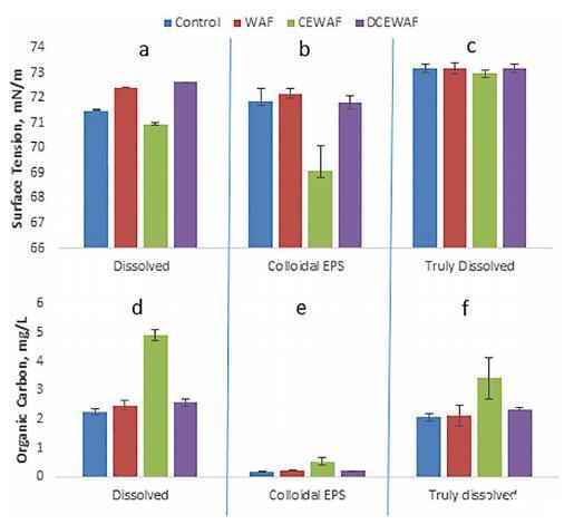 图 2 中的有机碳表明大部分溶解的 部分,图 2d,由低分子量碳组成,因为总溶解部分,图 2f,几乎等于 有机碳浓度中的溶解分数。 胶体 馏分(图 2e)表明超滤已去除了 85% 到 95% 的 溶解部分的有机碳。 这可能表明 5% 到 15% 的 CEWAF 可能保留在 EPS 胶体部分中, 表明 SFT 的降低(图 2b)也受 Corexit 的影响 和 WAF。 然而,使用 SFT 与 Corexit 浓度数据, 图 4b,即使是 15% 的 Corexit 也无法解释 在图 1 的 CEWAF 处理中测量的 SFT 降低。