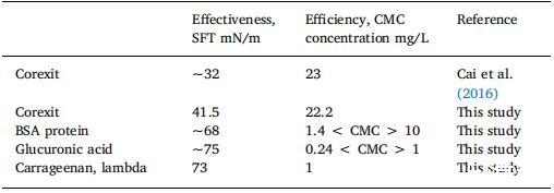 表 2 SFT 和 CMC 比较模型蛋白质和酸性多糖。 虽然Corexit 更有效地降低 SFT,EPS 模型成分更有效 因为需要低得多的浓度才能开始乳化(蛋白质)和 稳定成分(酸性多糖;结合大分子并添加 粘度)。