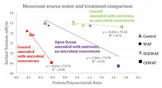 EPS 胶体溶液的 SFT 与 蛋白质(更疏水)到多糖(更亲水) 集中度,可以作为整体的相对度量 胶体部分的疏水性。 此外,图1中的数据 意味着石油和/或 Corexit 的存在导致增强 EPS 胶体的蛋白质:多糖比率,但降低了 胶体部分的 SFT。 CEWAF 中蛋白质含量较高 处理对应的细菌计数高于其他处理 治疗(Kamalanathan 等人,2018 年;Doyle 等人,2018 年)。 DCEWAF 还具有更高的蛋白质含量和更高的蛋白质:多糖 比 WAF 和对照处理。 值得注意的是,当 与不同的中宇宙实验相比,开阔的海洋中宇宙的油浓度高两倍,相对 DCEWAF 处理中的 Corexit 含量较高,即它们仅 ~6.3 倍稀释的 CEWAF,而 DCEWAF 处理来自 用微生物浓缩物修正的沿海水域约 15 倍 稀释的 CEWAF 和经过修正的营养物质的沿海水域是 ~ 10 倍稀释的 DCEWAF(表 1)。 因此,趋势线的斜率 可能受到 DCEWAF 中 Corexit 数量的影响,并且 CEWAF 处理 SFT 和蛋白质:多糖 比率。 由于其表面活性剂特性,Corexit 降低了 SFT,但它 还增强了蛋白质的产生,导致比对照和 WAF 处理更高的蛋白质:多糖比率。 这 相对 SFT 和蛋白质:对照和 WAF 的多糖位置 可能是由胶体和海水的组成和浓度的微小差异产生的。