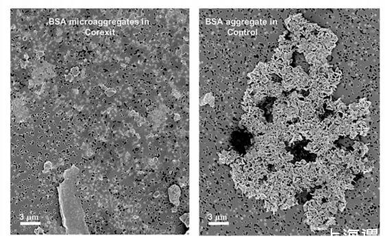 相同放大倍数下 BSA 聚集体的 SEM 图像(图 3b) 在 Corexit(左)和 ASW 中用 0.1% BSA 溶液制备 来自与图 3a 中相同的溶液的对照处理(右)。 这 Corexit 处理(左图 3b)显示来自液体的微聚集体 阶段。 对照处理(图 3b 右)显示了一个大结晶 蛋白质聚集体。 图 3a 和 3b 中描绘的结果支持 静电相互作用和共价键作用的重要性 在微聚集体形成中(Corexit 与 Ca2+ 离子突出显示 CTC) 和 Ca2+ 螯合中的配位共价键 CTC 和阴离子亲水部分(CEWAF、WAF 和对照 处理)形成比 Corexit 更少但更大的聚集体 治疗。