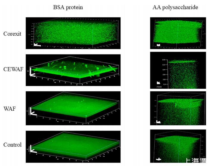 四种治疗的共聚焦激光扫描显微镜 (CLSM) 带有模型 EPS 组件的处理如图 3 所示。 ASW 显示在左侧 BSA 的 0.1% 垂直系列溶液中 右边是一系列 0.1% 的海藻酸溶液。 横向, 面板显示了 Corexit、CEWAF、WAF 的相应处理, 和对照,用于 BSA 和海藻酸溶液。 绿色荧光探针 CTC 突出显示与阴离子结合的亲水性 Ca2+ 多糖和蛋白质的区域。 对于海藻酸和 BSA实验,单独使用Corexit就可以分散模型分子 无界面积聚。 图像也显示出明亮密集 微聚集体中较高倾向的绿色荧光 Corexit 比在其他治疗中看到的要多。 海藻酸面板全部显示 聚集体的分散,而 BSA 面板显示主要在界面处的蛋白质。 CEWAF 海藻酸和 BSA 可以生成 清晰的界面层。 CEWAF 中的 BSA 显示聚合 当它们向上扩散时在垂直方向上被夸大 随着图像曝光的时间。 此外,BSA CEWAF 显示聚集体似乎在液体表面上方,因为它们是 在未显示的泡沫层之内和之上。 具有主要亲水部分的控制处理表现出较少的分散 和不太明显的界面层。 虽然垂直尺度较小 对于 BSA 图像比对于海藻酸图像,仍然很明显 海藻酸分散在整个体积中,而 BSA 迅速扩散到界面。 唯一的例外是 Corexit 处理显示没有界面积聚和完全分散 海藻酸和BSA。