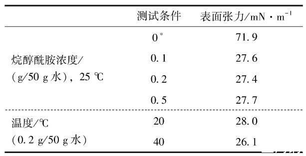 表1自制烷醇酰胺不同测试条件下表面张力