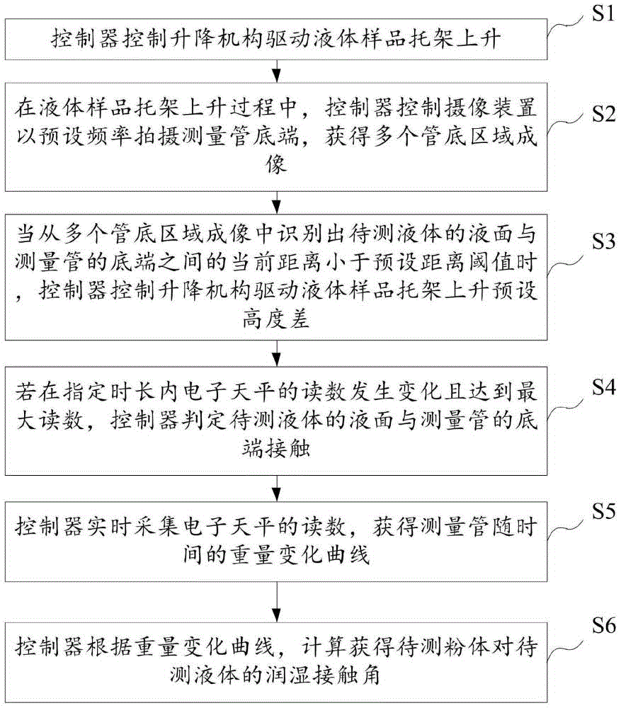 粉体材料润湿接触角测量方法应用于XVDEVIOS破解版安卓手机安装包,所述XVDEVIOS破解版安卓手机安装包包括壳体以及设置于壳体内的电子天平、底端用微孔板封闭的测量管、液体样品托架、升降机构和摄像装置;所述电子天平的底部设置有连接杆,所述连接杆与所述电子天平的称重盘固定连接,所述测量管垂直悬挂于所述连接杆下方,所述测量管的底端位于所述摄像装置的摄影取景范围中,所述测量管内装有待测粉体,所述液体样品托架用于固定装盛有待测液体的样品容器,所述液体样品托架由所述升降机构驱动升降;所述测量方法包括: