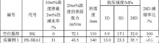 按上面步骤制备的减水剂进行配比,采用基准水泥或者代用的工程普通水泥,砂率39wt%,配合比(质量比)为水泥:砂子:碎石=330:720:1100,PE±SRA减水剂10wt%浓度掺量2wt%,通过调整用水量控制混凝土坍落度在90-145mm,检测后得知,PE-SRA系列与PE+SRA系列的表面张力相近,但相同掺量条件下PE-SRA系列的减水率和减缩效果远远好于PE+SRA系列。
