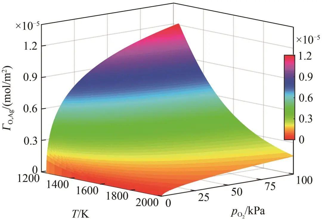 (3)当升高氧气压力,或降低体系温度时,表面过剩量逐渐增加。表面偏析因子则与氧气压力和温度均呈负相关,当降低氧气压力或温度时,O原子倾向富集于体系表面。
