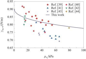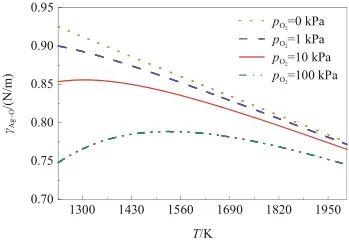 图6研究了在不同氧气压力条件下,γAg-O随温度的变化关系。由图可知,当氧气压力低于10 kPa时,γAg-O与温度呈负相关。而当氧气压力高于10 kPa时,随着温度升高,γAg-O呈现先增大后减小的趋势,并且随着氧气压力增加,这种转变幅度增大。这是因为γAg-O受温度和氧溶解度的共同影响。一方面,随着温度升高,液态Ag的表面张力(γAg)降低,从而导致γAg-O降低;另一方面,液态Ag-O系中的氧溶解度与温度呈负相关,当温度升高时氧溶解度下降,导致表面氧吸附量减少,进而引起γAg-O增加。因此,当温度较低时,氧溶解度成为影响γAg-O的主要因素;而在较高的温度条件下,温度成为主要因素。