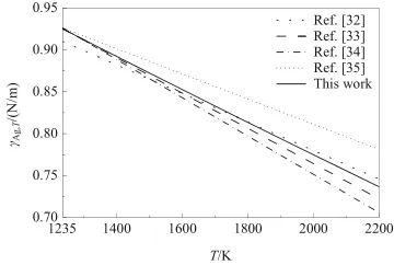 根据式(7),计算了液态Ag的表面张力γAg,T,结果如图3所示。总体上,随着温度的升高,γAg,T呈现近似线性下降的趋势。从图中可以看出,γAg,T的预测值与文献[32-34]具有较好的一致性,但略低于文献[35]。