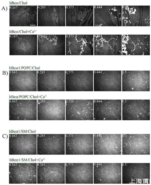 图2.(A)hBest1/Chol单分子层、(B)hBest1/POPC/Chol(C)hBest1/SM/Chol单分子层的BAM图像(摩尔分数为Chol 0.167;0.285;0.375;0.444和0.5)Ca 2+的存在与否,在35±2°C。白色比例尺=100µm。