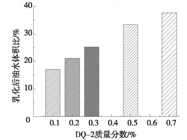 由图4可知,不同浓度的DQ-2体系均具有一定的乳化作用,随着体系浓度的增加,吸水量不断降低,原油乳化作用不断增强。当DQ-2体系的质量分数达到0.5%时,油水体积比为33.47%,后期继续提高DQ-2体系的使用浓度,油水体积比趋于稳定,通过实验证实,DQ-2体系对于原油具有较好的乳化作用。