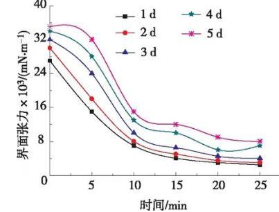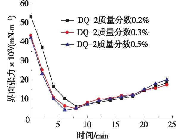 测定低界面张力表面活性剂DQ-2体系的质量分数分别为0.2%,0.3%,0.5%的油水界面张力,不同浓度目标体系的油水界面张力随时间变化曲线见图1。