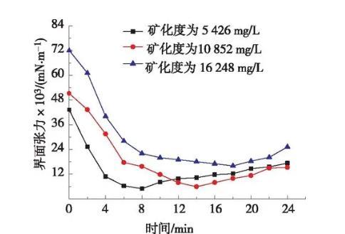 体系耐盐性直接影响其驱油效果。在油藏温度80℃条件下,测定DQ-2在不同矿化度条件下的油水界面张力,实验结果见图3。