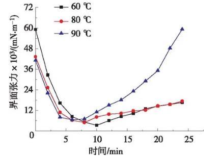 考察不同温度条件下体系的油水界面张力,评价该体系在油藏温度条件下的温度适应性和耐温性能,实验结果见图2。