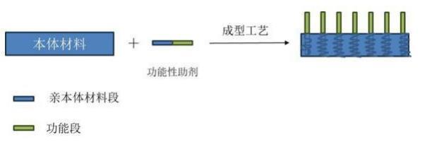 1.脱模剂通过亲本体材料段和功能段嵌段共聚的方式,使得功能助剂经亲本体材料段牢固地悬挂在本体材料表面。