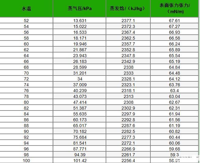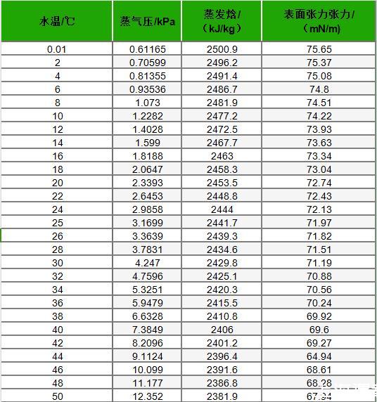 不同温度下水的蒸气压、蒸发焓及表面张力