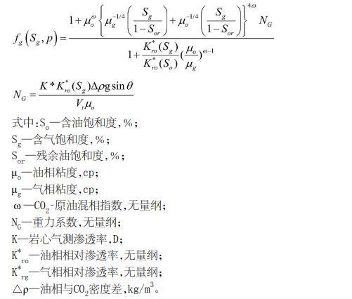 结合CO2黏度、原油黏度,推导出具有重力效应的带倾角储层气体分流率方程为: