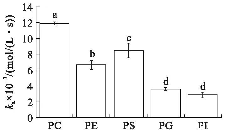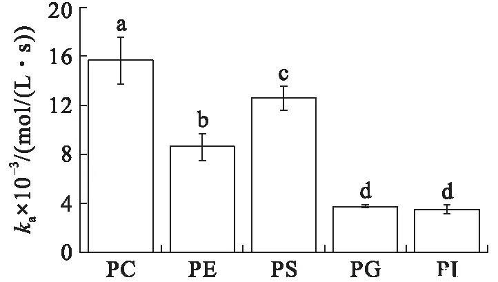 在初始表面压力为25 mN/m的条件下(见图4),VhPLD对PC的吸附常数最大((1.46±0.10)×104mol/(L·s)),对于PG((3.58±0.31)×103mol/(L·s))和PI((4.30±0.34)×103mol/(L·s))的吸附常数最小。在该初始表面压力条件下,VhPLD对于PC、PE和PS的解离常数之间不存在显著差异(P>0.05),该结果与在15 mN/m所测定的结果保持一致。而在该条件下获得的VhPLD对不同磷脂单分子层吸附偏好性顺序为PC>PS>PI>PE=PG。