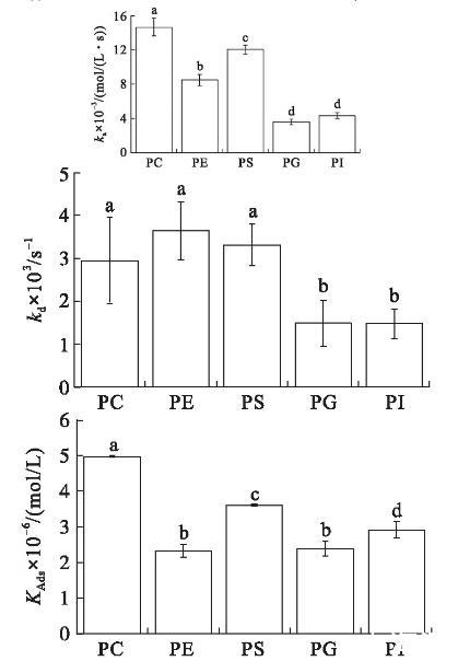 图2初始表面压力15 mN/m的条件下VhPLD对PC、PE、PS、PG和PI的吸附动力学参数
