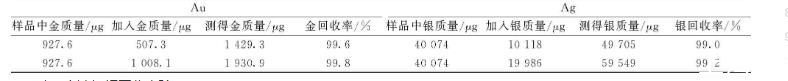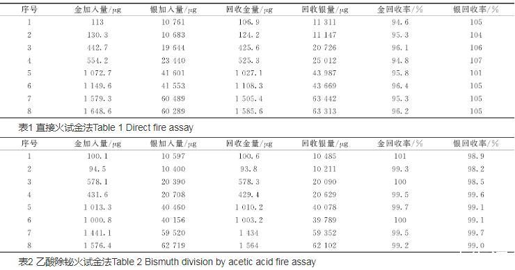 表2结果为用乙酸除铋火试金法,再进行如表1的实验,从表2可以看出金加标回收率99.2%~101%,银加标回收率98.2%~99.7%,说明已消除铋的干扰,结果准确可靠。