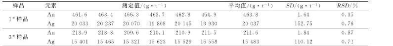 选取两个粗铋样品,1#和3#样品进行实验,称取2.000 g粗铋样品,按照以上实验方法进行实验,每个样品做了6次平行实验,结果如表7所示,金相对标准偏差(RSD)为0.35%~0.87%,银相对标准偏差(RSD)为0.76%~0.71%。