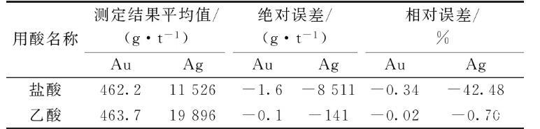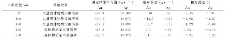 实验样品金含量463.8 g/t,银含量20 037 g/t,进行除铋用酸量的实验,试验用酸为乙酸(1+1),结果见表5,从结果可以看出50、100 mL乙酸用量,大部分固体物质没被溶解,大部分铋没被除去,乙酸用量200 mL时,固体物质基本被溶解,结果较准确,可以满足测定要求。在结果准确的情况下选择用量少的,所以实验选择乙酸用量为200 mL。