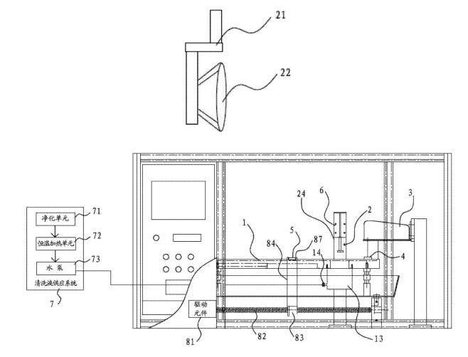 [0018]在一些实施方式中,还包括清洗液供应系统,清洗液供应系统包括净化单元、恒温加热单元和泵体。清洗液通过净化单元净化并通过恒温加热单元进行加热后,再经由泵体供应到清洗槽当中。其有益效果是,先通过净化单元,可以预先清除掉清洗液当中可能存在的油。另外,通过恒温加热单元可以将清洗液加热到一定的温度。因为温热状态的清洗液,可以实现更加的油脂清除能力,从而可以将样品上的油更方便且更完全的清洗下来。
