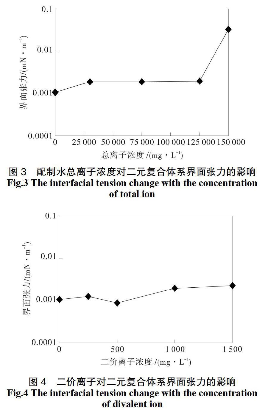 但界面张力随着矿化度及二价离子浓度的增加依旧发生小范围的波动,这种影响的主演要原因是由于水中阳离子增大了表面活性剂分子向油水界面扩散的速率并且阳离子可以进入双电层使界面层中活性剂分子排列更紧密。另一方面,金属阳离子对二元体系聚合物分子发生蜷曲,间接影响二元体系界面张力。