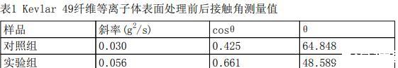 测量结果如下表所示,测量结果为三次平行样的平均值。可见经等离子体表面处理后,芳纶纤维与水的表面接触角降低16°,润湿性提高。