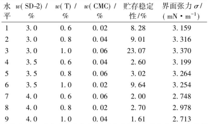乳化剂SD-2,缔合型增稠剂T和羧甲基纤维钠等是CA砂浆阴离子乳化沥青中最关键的3种组分,对乳化沥青的性能起着决定性的影响。为了比较对油水界面张力和乳化沥青贮存稳定性的影响,采用L9(34)正交试验的方法进行优化设计,因素水平见表1。