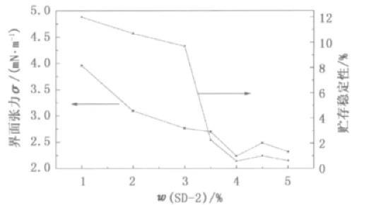 从分子结构上来看,羧甲基纤维钠也属于表面活性剂的范畴,具有一定的乳化能力。因此,羧甲基纤维素钠与乳化剂SD-2具有较好的协同效应,在较低的质量分数时就能够显著降低界面张力值,改善乳液的贮存稳定性。