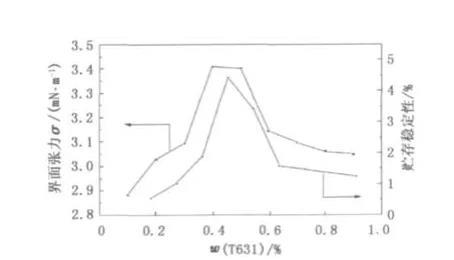 图3缔合型增稠剂T对油水界面张力和贮存稳定性的影响