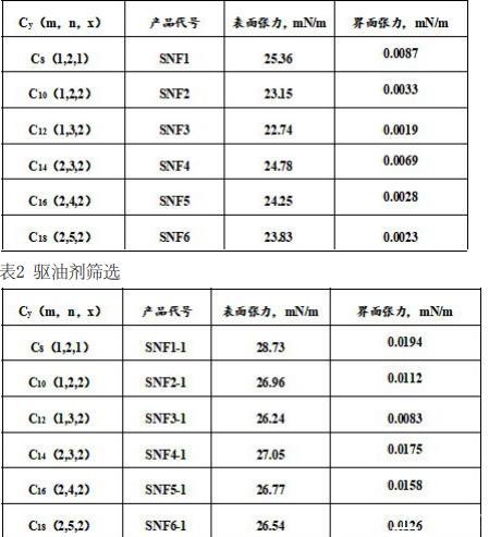由表1可知,当m、n、x的摩尔比为1:3:2时,制得的驱、渗一体化驱油剂的亲油碳链主链长度为12,此时该驱、渗一体化驱油剂的表面张力和界面张力均达到最低值。