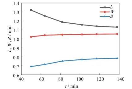 图7为数值仿真过程中液滴三轴随时间演化规律。综合对比图4和图7,数值仿真软件与实验过程中球形液滴的三轴长度变化趋势基本一致。可以看出,在体积保持不变的假设下,球形液滴的第二半轴和第三半轴变形频带是不一致的。该结果表明一些黏弹性液滴的变形和收缩不严格符合仿射变形假设(即第三半轴W始终等于第二半轴B),这与文献结果类似。数值仿真结果中液滴最终形态不是一个三轴长度相等的球形,主要原因是仿真过程中使用的非牛顿流体的本构模型只对黏性项进行了修改,而忽视了弹性应力的影响,因此与理论计算结果有一定误差。