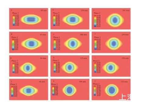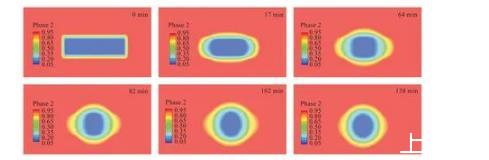 由计算流体力学后处理软件所得到的液滴形态变化图,可以看到液滴由最初的圆柱形变化成椭球形,再由椭球形变化成球形。与实验所得到的各时刻形态图液滴变化趋势相同,时间上略有误差,可能是由于基质导热速率、加热台功率,以及室温的影响。