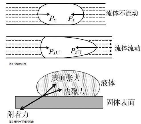 如图4所示,当流管中流体不流动时,流体中的气泡呈椭球状,两边对称.但当流体流动时会造成气泡的变形,沿流体前进方向,气泡前端被“拉伸”而变尖,曲率半径变小;而后方被“推压”而变凸,曲率半径变大.由(2)式可知,前端的附件压强PS前要比后端的附加压强PS后大,从而造成流体流动受阻.当气泡较多时阻力随着增大,就造成了气栓。