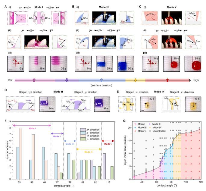 注入结构化表面的液体首先填充相邻四个单元间的空隙,并在单元的特定曲率结构处形成局部曲率不等的液体弯月面,这导致液体表面不同位置的拉普拉斯压差不同,进而驱动液体定向运输。随表面张力从低到高(22-72 mN/m),液体呈现出五种不同的运输模式(I至Ⅴ)。研究人员利用水-乙醇溶液对这五种模式下液体沿x轴和y轴方向上的运输行为进行力学分析(图2)。表面张力较低的液体对界面的润湿性较高,因此主要在单元底部曲率结构作用下,沿拉普拉斯压差较低的方向运输;而表面张力较高的液体会在结构化表面上积累,其运输方向由单元顶部曲率调控。