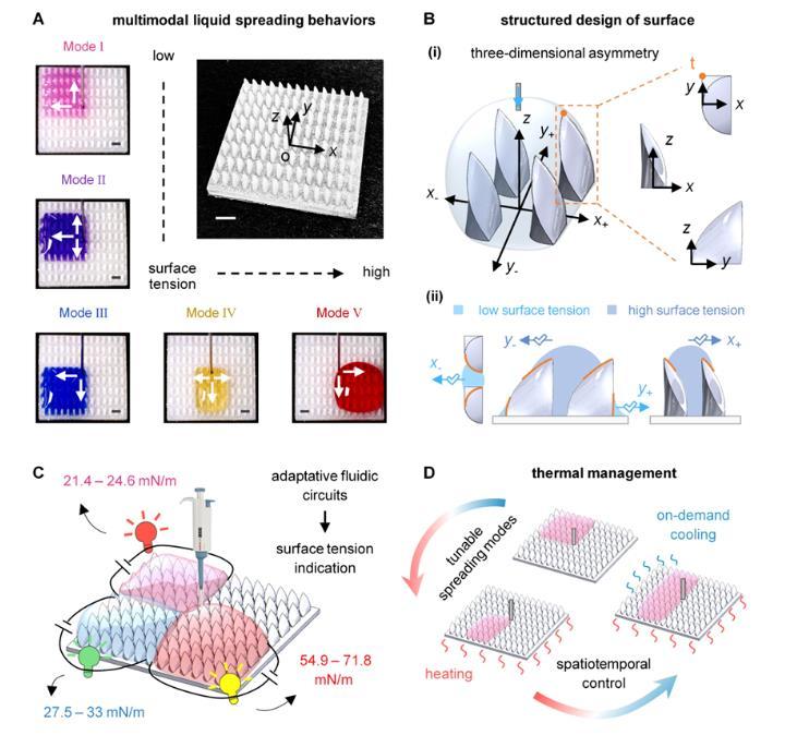 图1:结构化表面上的多向液体运输行为及潜在应用。