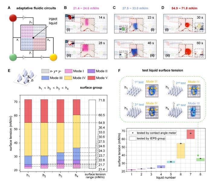 结构化表面可根据液体表面张力控制不同的运输方向,从而仅用一块表面即可构建自适应液体特性的多路径电路,而无需组装复杂的液体控制模块。如图3所示,通过使用特定表面张力的导电液体,能在该表面上选择性点亮目标LED灯,从而简化了复杂电路的构建。