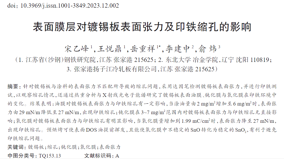 针对镀锡板与涂料的表面张力不匹配所导致的缩孔问题,采用达因笔检测镀锡板表面张力,并进行印铁测试,以观察缩孔情况,还通过热重分析与X射线光电子能谱研究了镀锡板表面油膜、钝化膜与氧化膜在印铁环境中的变化。