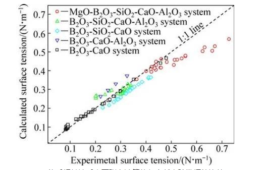 图1 MgO-B2O3-SiO2-CaO-Al2O3体系相关渣系表面张力计算值与文献实验数据的比较