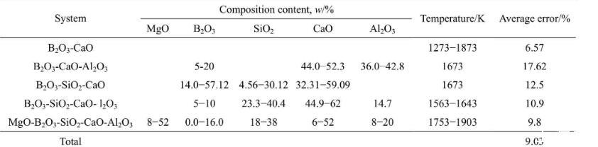 表4富硼渣相关实验渣系组分、温度及相对平均误差