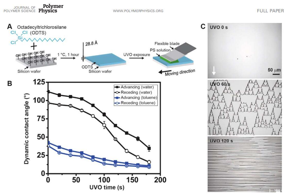 抛光硅片(直径 100 mm,厚度 500 lm, 100 方向,P/B 掺杂,大学晶圆)衬底 (通常切成 1.2 3 1.2 厘米)通过冲洗制备 用甲苯、丙酮和去离子水,在下干燥 氮,然后用 Harrick 氧等离子体处理 250 mTorr 持续 20 分钟。 氧化层厚度用椭偏仪测量(折射率,n1 5 1.46-设置,LSE Stokes 椭偏仪,Gaertner, Inc.)。 将表面改性的基材转移到密封的 20 mL 闪烁瓶中,该瓶中装有 1 L 正十八烷基三氯硅烷 (ODTS)(95%,Gelest, Inc.)和 999 lL 甲苯(使用来自 Fisher Scientific) (按体积计 0.1% ODTS)。 每个小瓶都放入冰水中 浴 1 小时,将温度调节至 1 8C。 1 小时后, 按照相同的预处理过程冲洗和干燥每个小瓶中的改性硅晶片,但不包括 20 分钟 氧等离子体处理。 然后将晶片在 120 8C烘箱2小时,冷却至室温,在甲苯中超声60秒。 晶片再次冲洗并 干了。 ODTS 层的厚度测量 椭偏仪(ODTS,折射率,n2 5 1.457,Gelest, Inc.)作为 28.8 6 0.83 Å(20 个样品的平均值)[图。 1(A)]。 控制 表面能,改性ODTS层用 不同曝光时间的 UVO(Jelight 342 UVO 系统)。 紧接着,基板被用于测量 动态接触角或流涂。