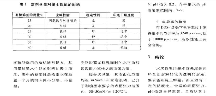 喷墨墨水中有机溶剂的成分及所占的比例对墨水的性能影响非常大。一般情况下,溶剂的用量是墨水重量的10%-50%。当溶剂含量低于10%时,作用不明显,超过50%时有些染料则无法溶解。