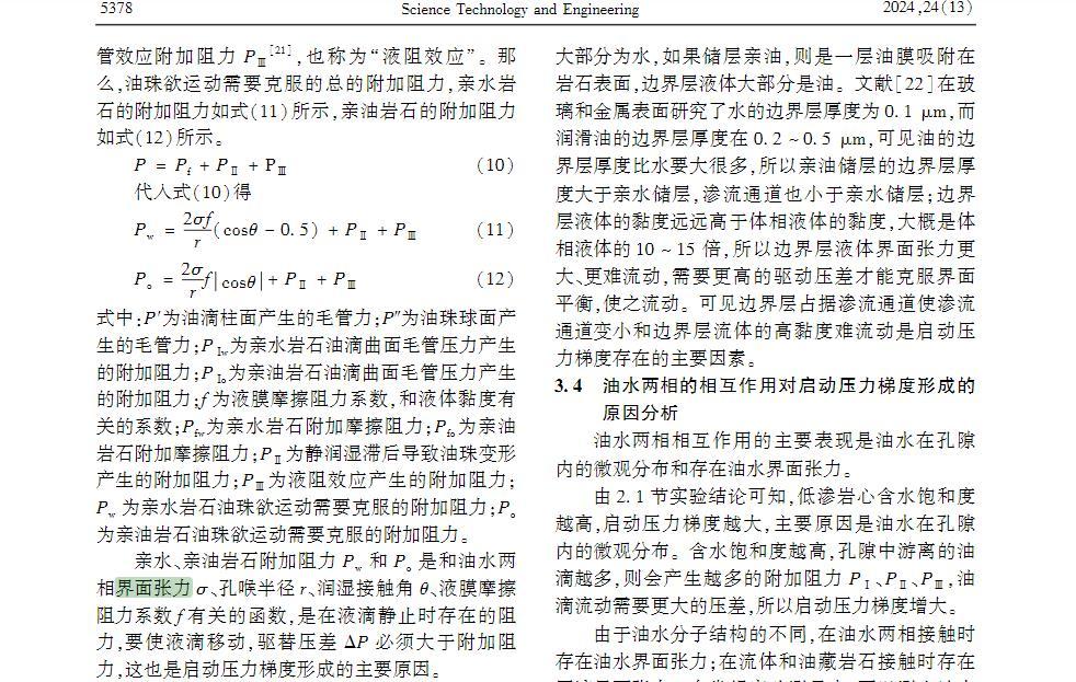 亲水、亲油岩石附加阻力Pw和Po是和油水两相界面张力σ、孔喉半径r、润湿接触角θ、液膜摩擦阻力系数f有关的函数,是在液滴静止时存在的阻力,要使液滴移动,驱替压差ΔP必须大于附加阻力,这也是启动压力梯度形成的主要原因。
