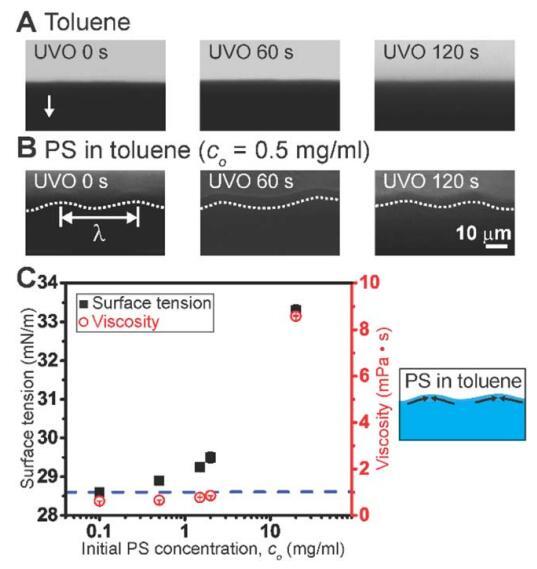 图 2 (A) 仅通过流涂的甲苯的弯液面前端。 箭头表示流动后退方向。 (B) 弯月面 聚苯乙烯(PS)在甲苯中通过流涂的前面。 白色的 虚线是眼睛的指南,半月板前面跟随 k 的周期波长。 (C) 表面张力和粘度作为 初始 PS 浓度的函数。 蓝色虚线表示甲苯的表面张力。 示意图说明 可能由表面张力梯度引起的流动(由 浓度梯度)用于在弯月面蒸发前沿的甲苯中的 PS。