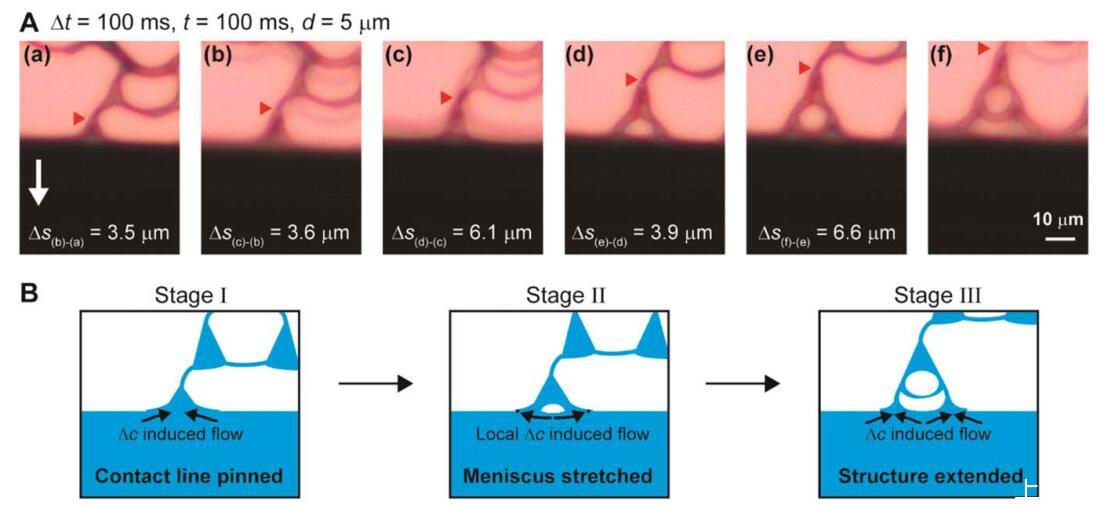 揭示自发结构形成的细节 超支化结构,XVDEVIOS官方下载免费版采用原位显微镜[图。 3(A)]。 视频图像显示超分支 结构通常分三个阶段形成[图。 3(B)]。 XVDEVIOS官方下载免费版注意到,由于XVDEVIOS官方下载免费版的弯液面的动态 过程中,XVDEVIOS官方下载免费版很难测量波长 动态弯液面。 在第一阶段,手指平行于 由于马兰戈尼不稳定性而出现流动方向 和摩擦。 重要的是,三角形半月板将手指连接到半月板前部。 由于手指是 与本体溶液相比,PS 的浓度更高, 手指的表面张力相对较高,拉入 本体溶液,具有较低的表面张力。 这一步是 如图3(B)(a)所示。