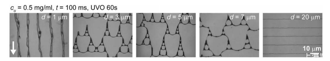 图 4 PS 模式作为设定距离 d 的函数,具有常数 co (co 5 0.5 mg/mL)、t (t 5 100 ms) 和 UVO 暴露时间 (60 秒)。 白色箭头表示流动后退方向。