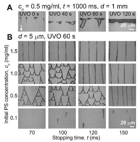 图 5 (A) PS 图案作为 UVO 曝光时间的函数 具有恒定的初始 PS 浓度 (co 5 0.5 mg/mL)、停止时间 (t 5 1000 ms) 和设置距离 (d 5 1 mm)。 这 白色箭头表示流动后退方向。 (二) 聚苯乙烯 模式作为 co 和 t 的函数,同时保持不变 距离 (d 5 5 lm) 和 60 秒的 UVO 曝光时间。