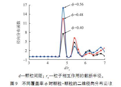 图9不同覆盖率ϕ时颗粒-颗粒的二维径向分布函数为了研究界面颗粒覆盖率对界面张力的影响,建立了底面边长为30rc、高度为40rc的正方体模拟区域来容纳更多的颗粒,分别将不同数量的颗粒随机放置于界面上,并采用2种方法计算不同颗粒覆盖率下的界面张力。