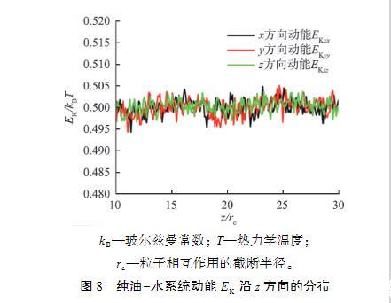 在界面张力的模拟计算公式(5)中,界面张力来源于界面附近处法向压力和切向压力的差值,pxx、pyy和pzz是压力张量p的3个对角分量,压力张量p又可以进一步分解为与原子速度和力有关的项,即p=(2EK+EV)/V,其中EK为与原子速度有关的动能项,V为系统的体积,EV为与原子间相互作用力有关的维里项,EV=∑Ng=1Fg⊗rg,其中Fg为系统中作用于原子g的力,rg为原子g的位置,N为系统中的原子总个数,⊗表示张量积。由于Δp=pzz-0.5(pxx+pyy),也可以写成Δp(2ΔEK+ΔEV)/V,其中动能的变化量ΔEK可以定义为,其中Δp为压力的变化量,ΔEV为维里项的变化量,EKzz为z方向的动能项,EKxx为x方向的动能项,EKyy为y方向的动能项。为了观察动能项对界面张力的贡献,本文中计算了纯油-水系统的动能沿z方向的分布,结果如图8所示。从图中可以看出,纯油-水系统的动能在界面附近基本不变,即动能的贡献很小,与文献中的研究结果一致,因此压力张量p中与原子相互作用有关的维里项在界面张力中起主要作用。因为压力张量中的动能项对压力影响很小。